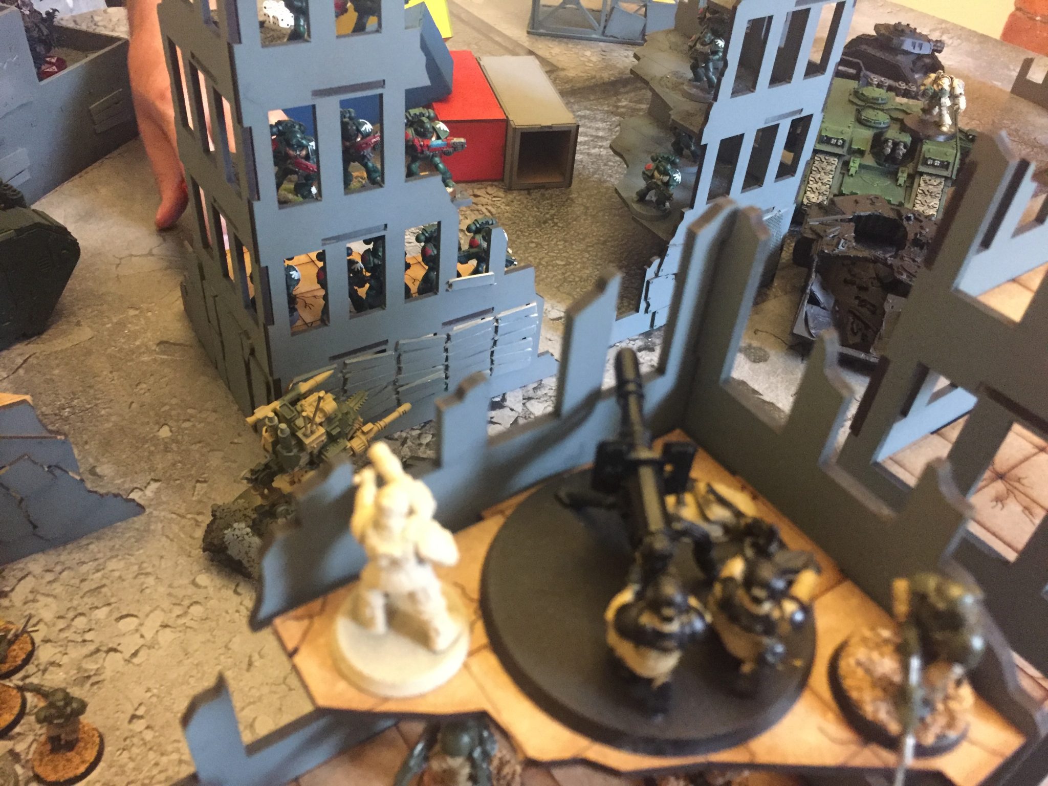 My two Infantry Squads with Lascannons I placed in four story high ruins to get a height advantage. Creed stayed with one of the squads, as did Kell. I needed Creed near a Vox Caster.