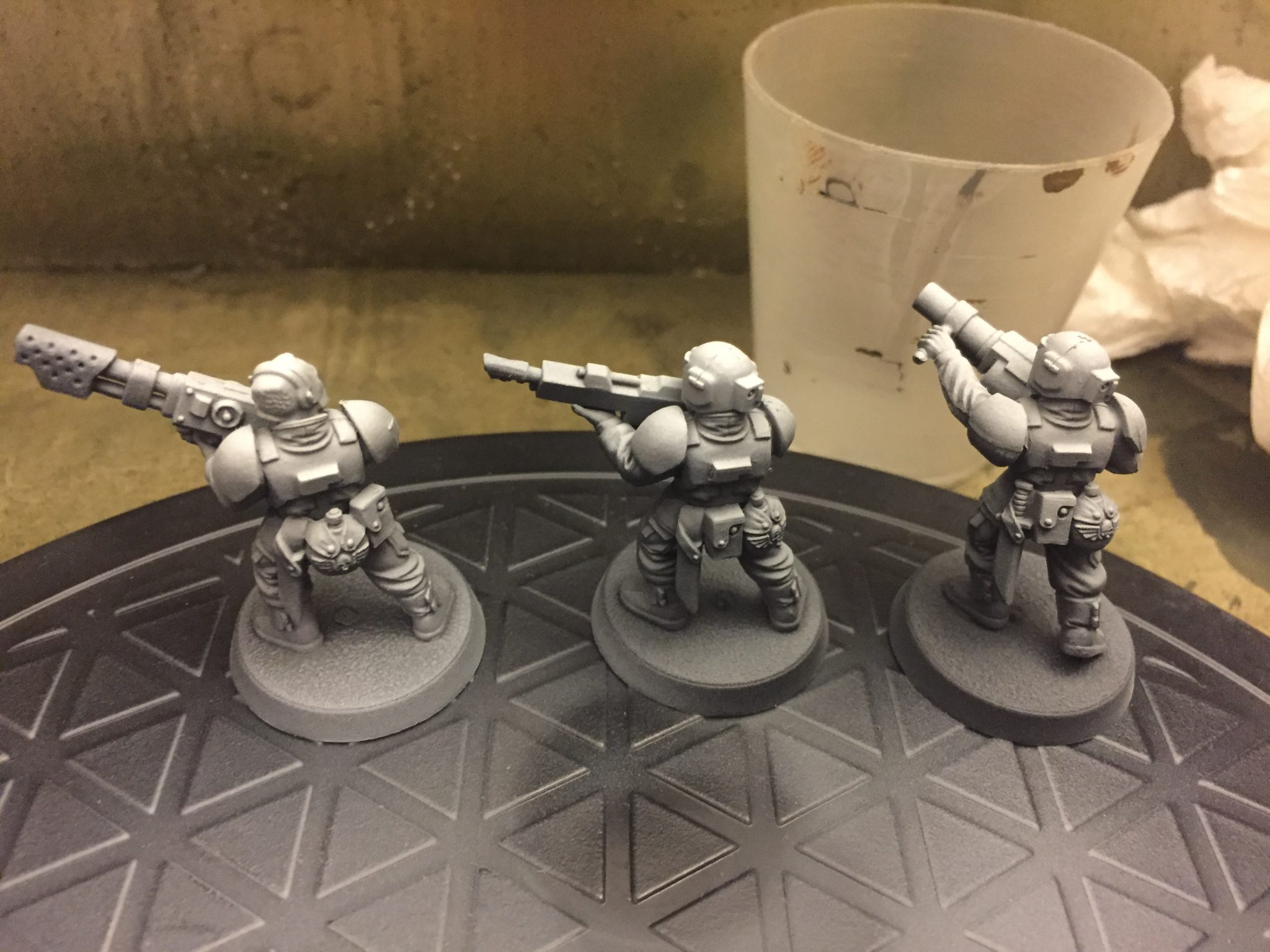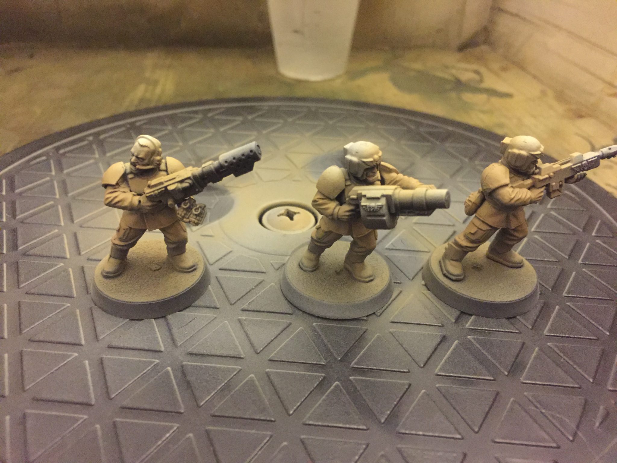 I started out with two Guardsmen from eBay, they’re primed black and mounted on champagne corks – like all Guardsmen should be. It’s a right of passage and part of being welcomed into my Cadian Guard regiment. I’ve probably got a hundred or more Cadian Shock Troops to paint – so any speed improvement will be massive once applied across so many models. If airbrushing Cadian Shock Troops saves just two minutes per model I’ll be happy – as that’s nearly three hours saved during the course of hundred models. Thats a whole game’s worth of time!