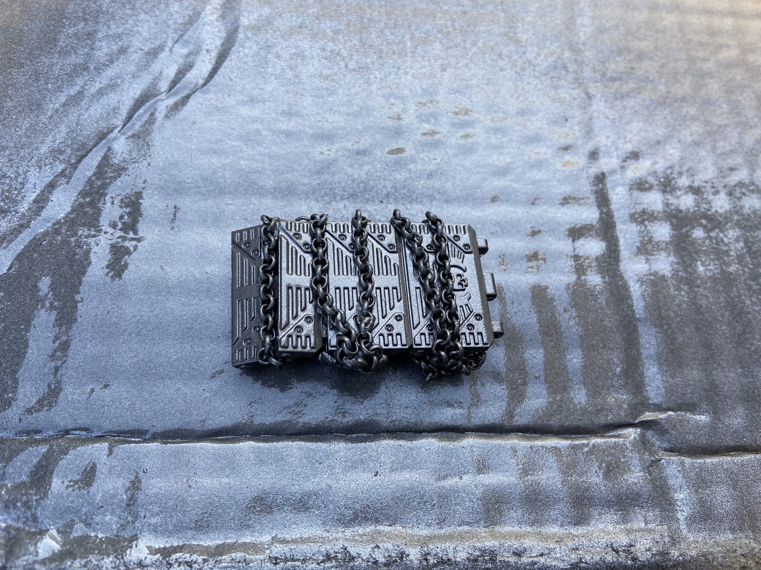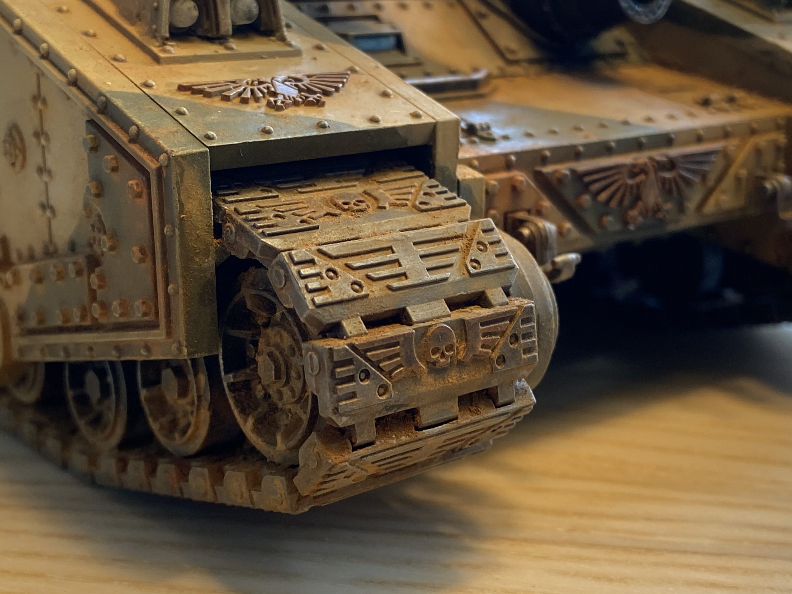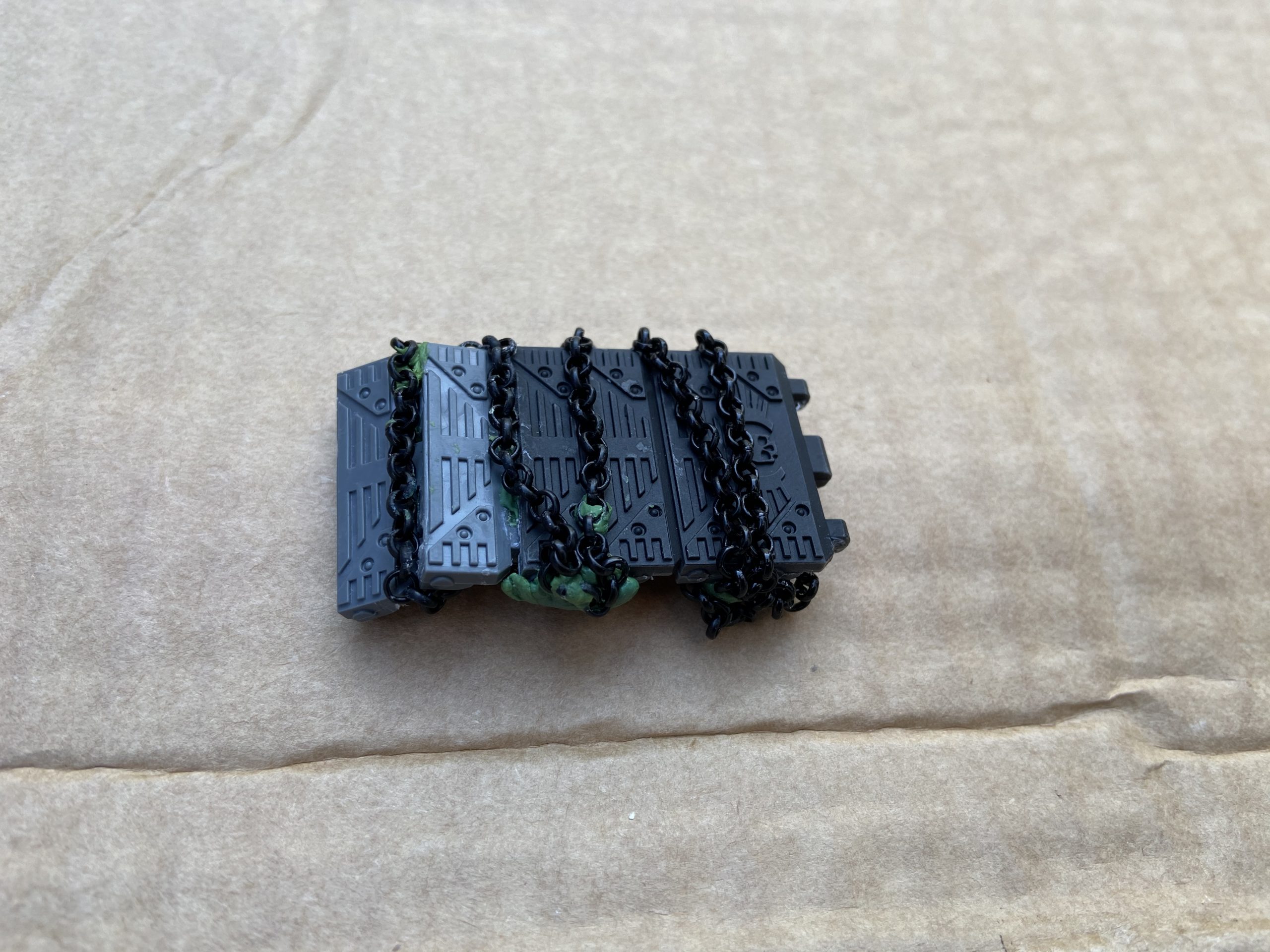 At present, I have some spare pieces of track with some sandbags on top as my magnet. On the underside of the track are three magnets that when placed near the Reed Switch turn it on. It is also laced in chains that run around the track and then under the Baneblade to make it look like its held together with chains. The chains stick to some tiny magnets under the Baneblade so they can hang loose – which looks kind of cool! The tracks and chains were painted with Leadbelcher and then washed with Nuln Oil. They also got some pigments added.