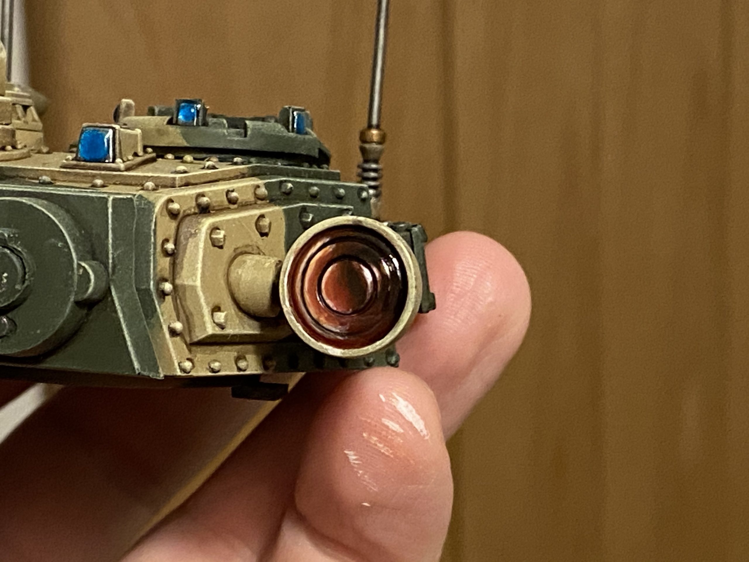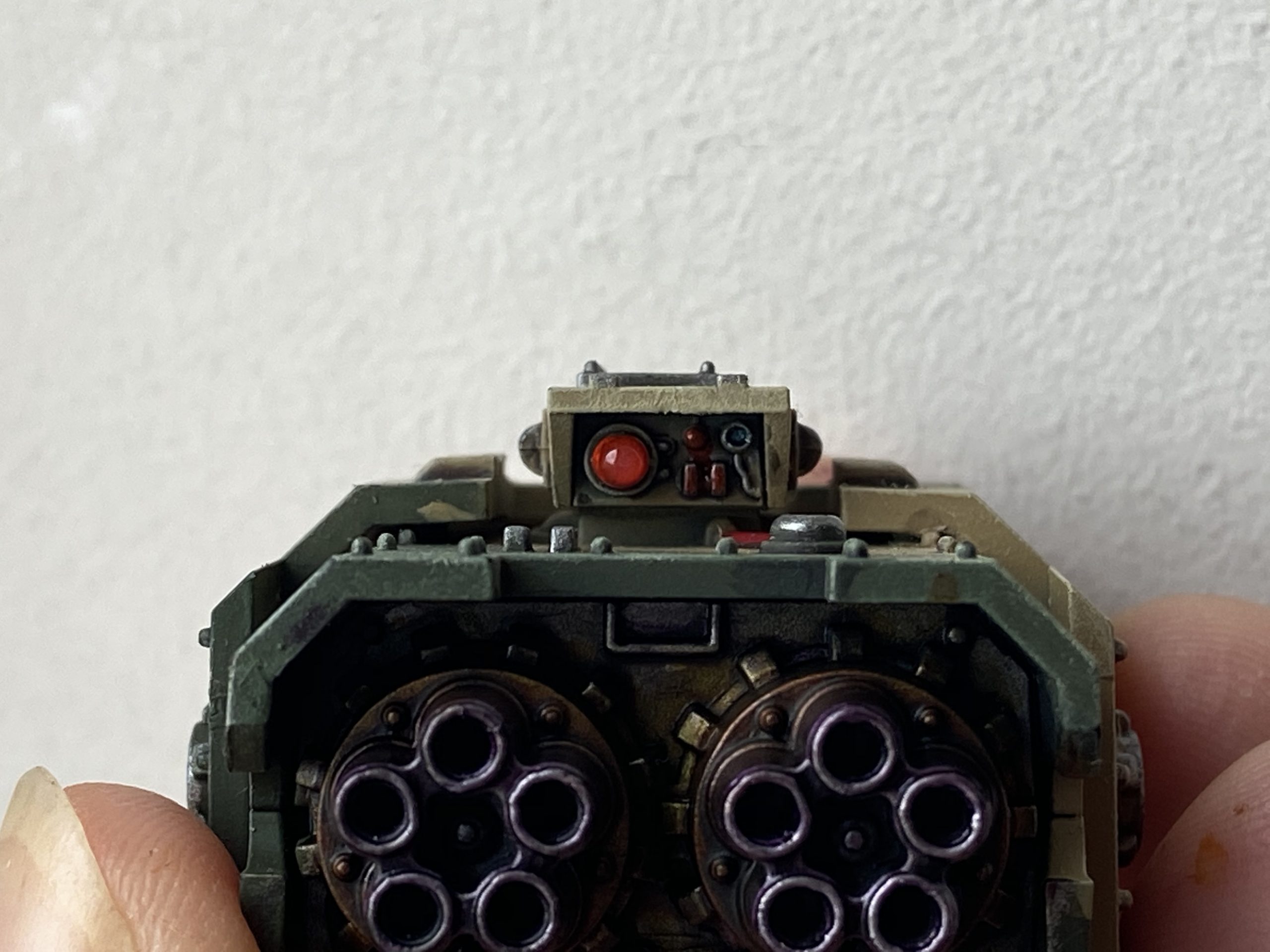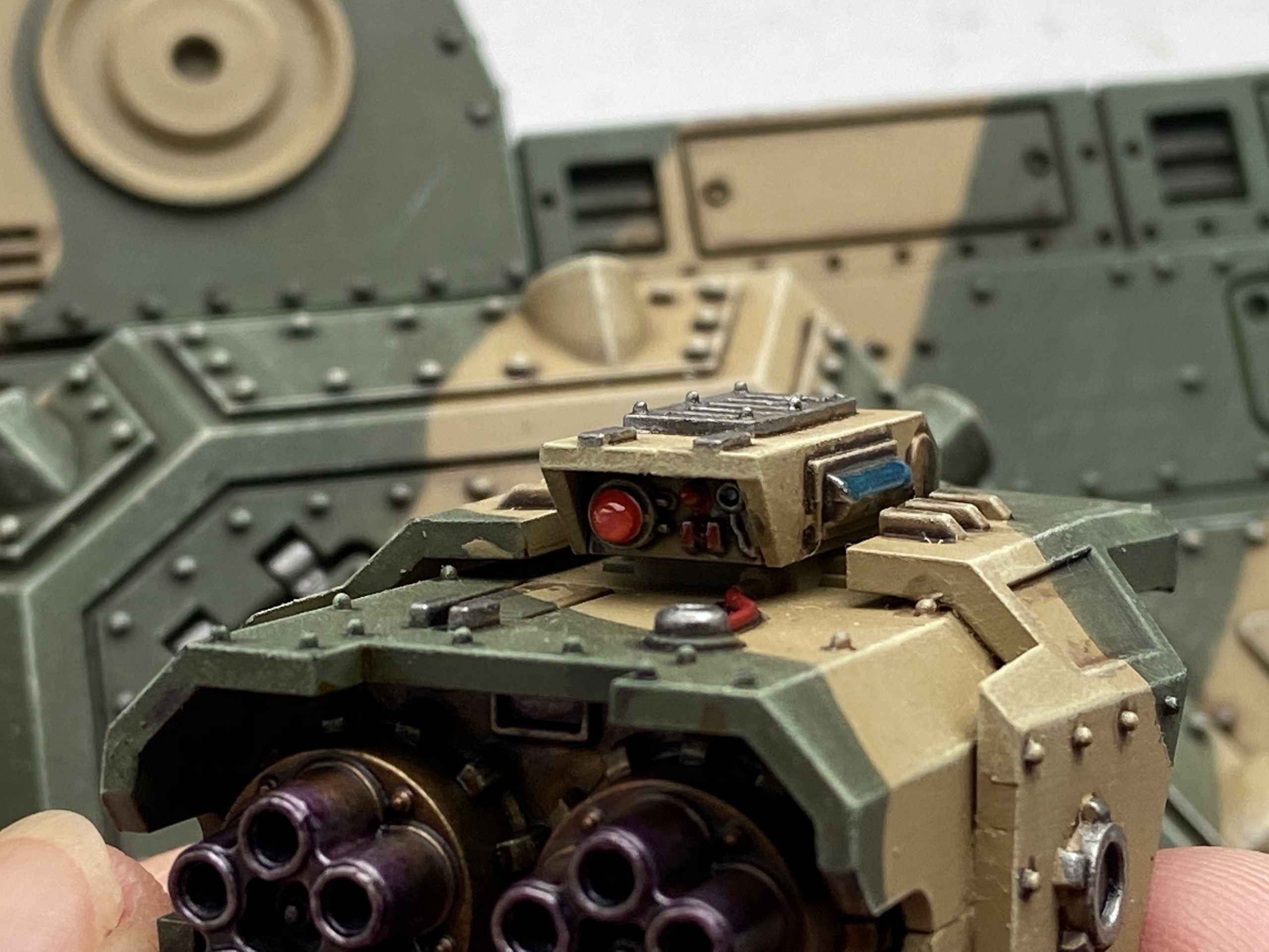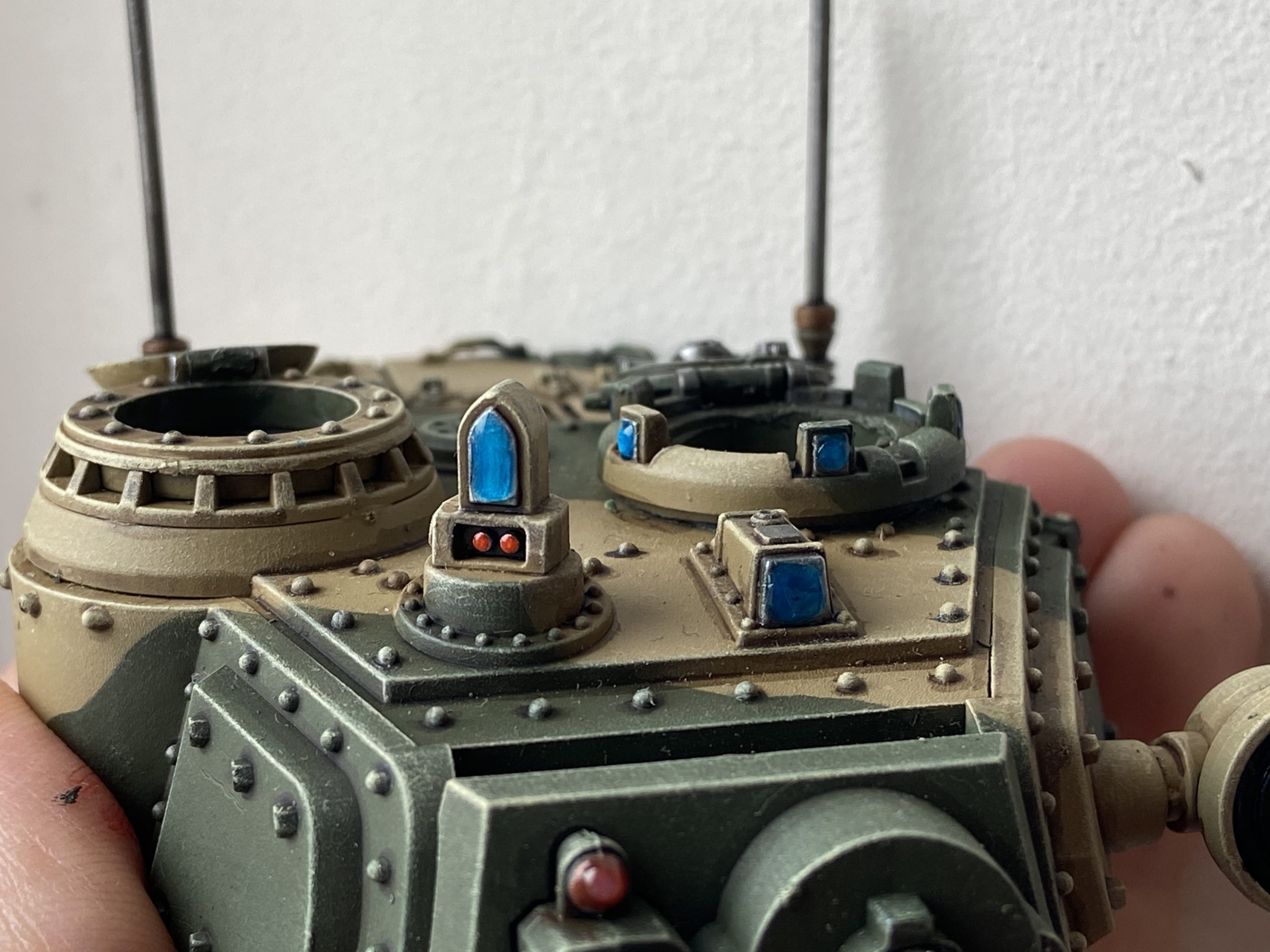 I use Games Workshop Gemstone paints for the small lenses on the Baneblade;