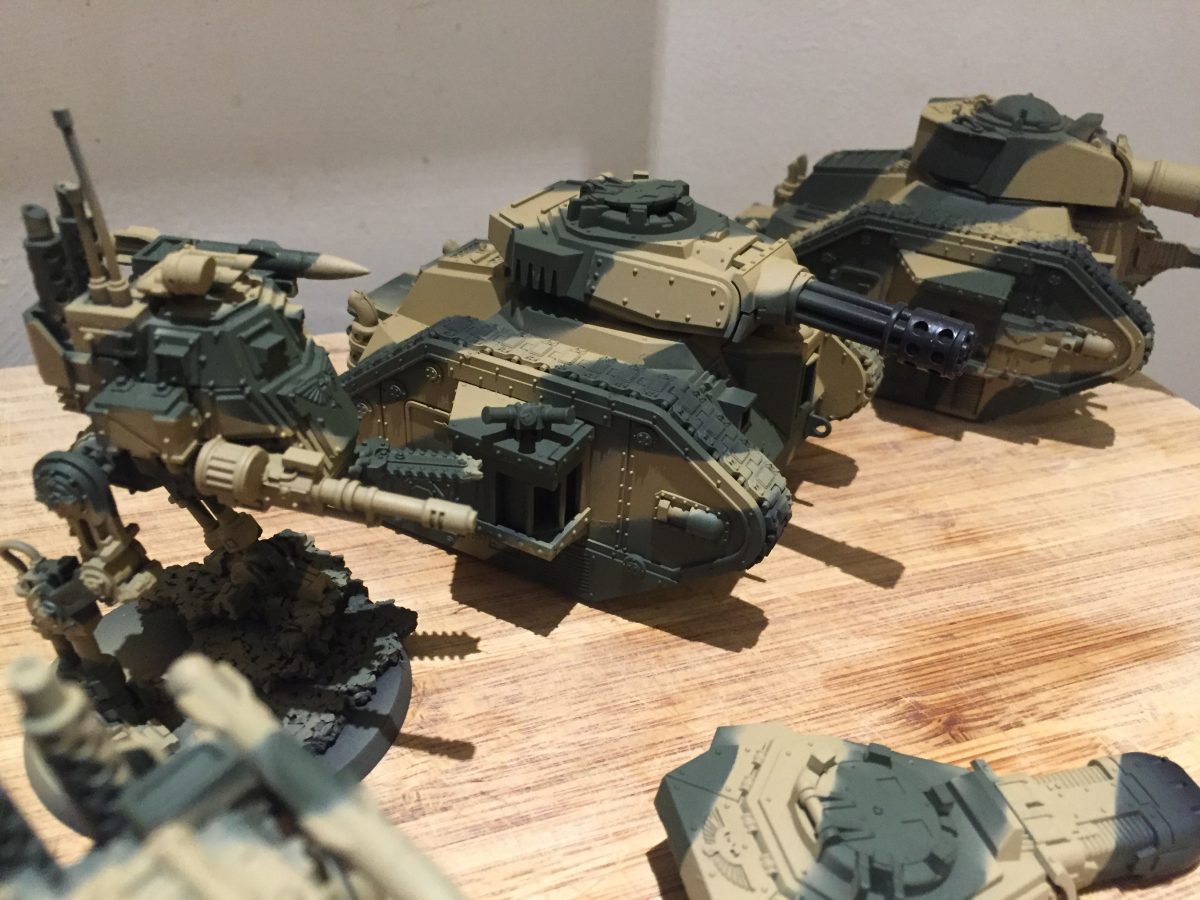 I took to my airbrush to get some more base layers down for my Cadian Camo scheme on 2 Leman Russ and 2 Sentinels.