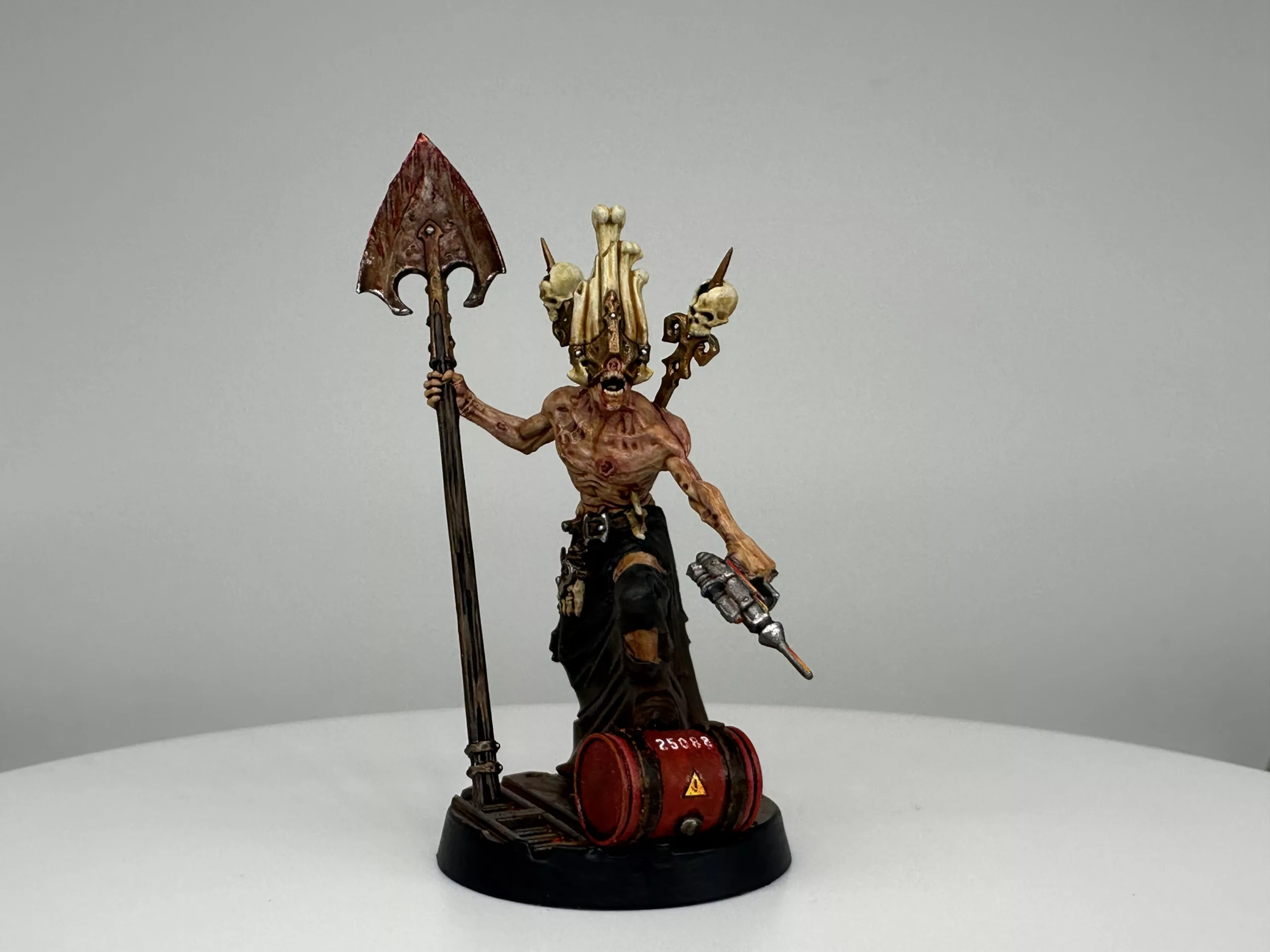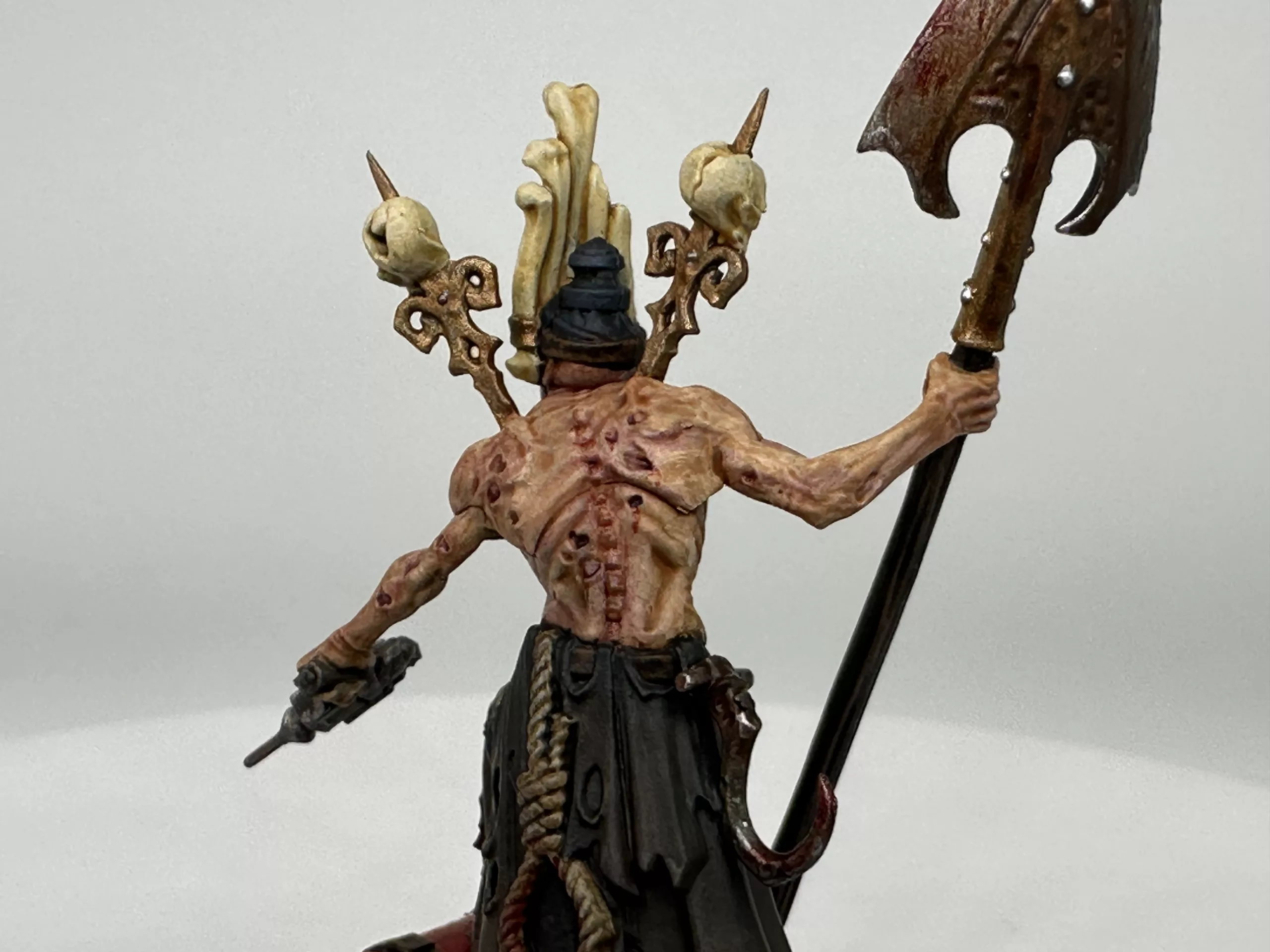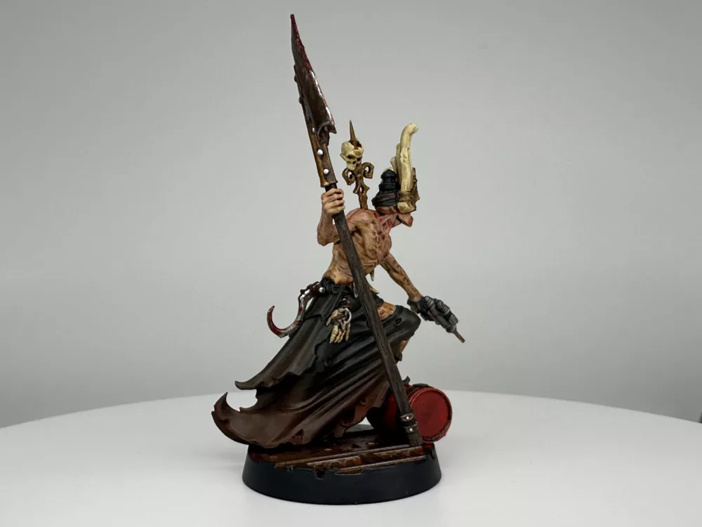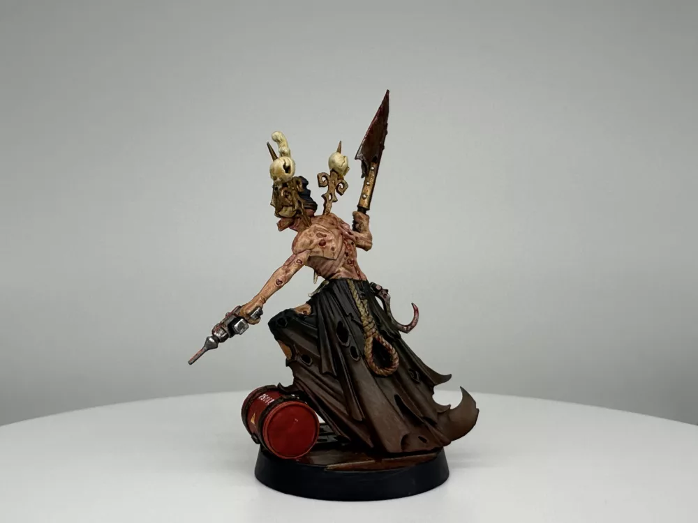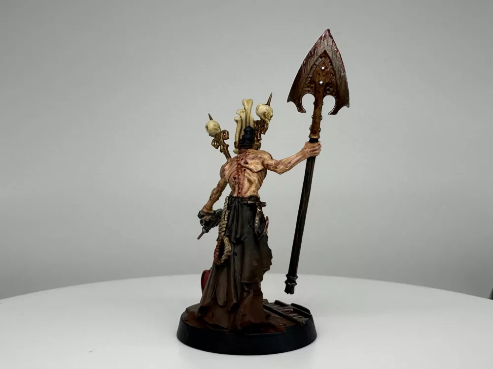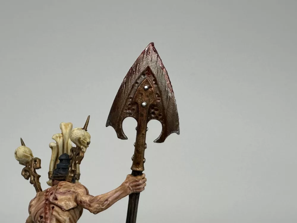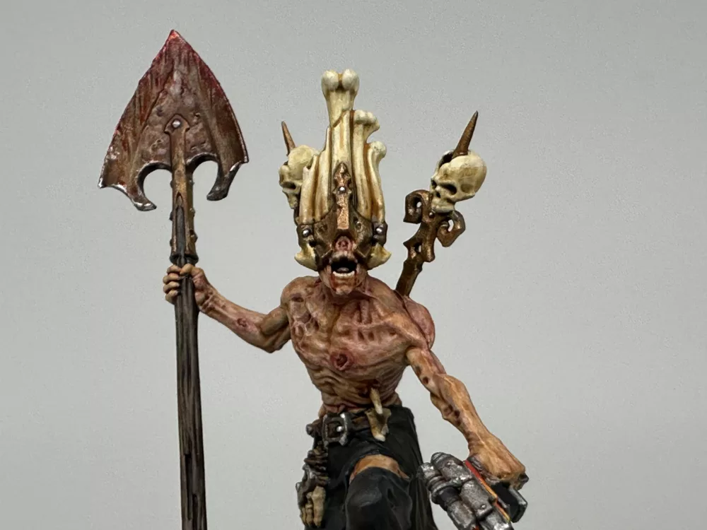 In that final moment the whisper revealed itself as a Khornate herald, drawn to the Skull’s endless carnage. Caldrik did not resist. He yielded, and the daemon entered him fully, burning away his name and his past. From that union came Skarth Veydrath, the Maw of Red Silence, a being of unending hunger and ceaseless fury. He is no mere Corpse Grinder cultist but a fallen lord entirely consumed, his will and flesh fused to the daemon’s purpose.